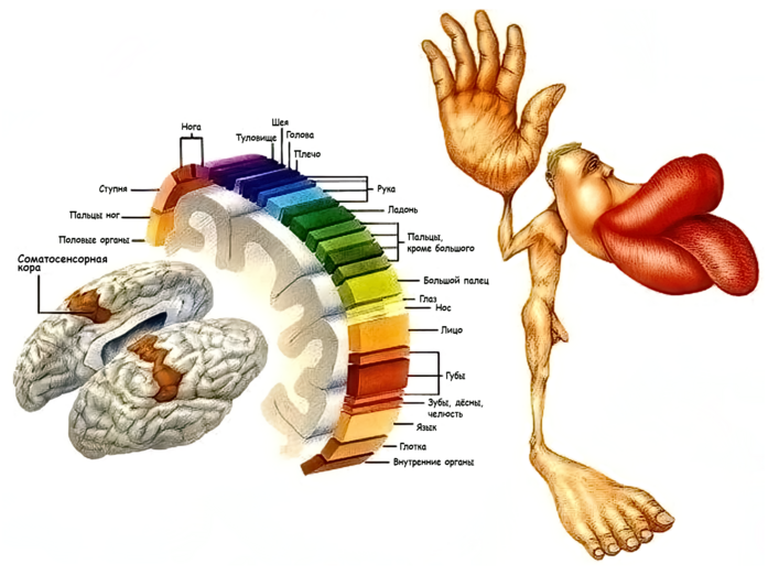 Во многих учебниках по нейрофизиологии можно обнаружить изображение удивительного существа — соматосенсорного гомункулуса. В основу гомункулуса положена фигурка человека, но размеры разных анатомических областей его тела выполнены в масштабе, пропорциональном числу находящихся в них рецепторов и, соответственно, площади, приходящейся на эти анатомические области зоны соматосенсорной коры.