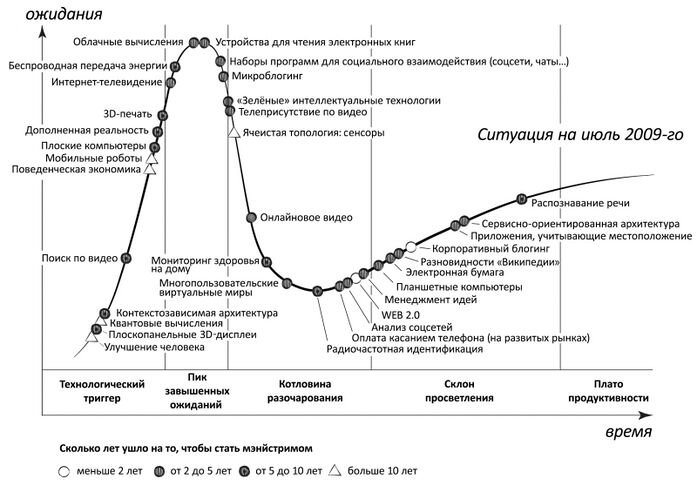 По всей видимости, благодаря развитию интернета и социальных сетей многие общественные процессы сегодня рассматриваются и обсуждаются в первую очередь с медийной точки зрения: само общество представляется в роли своеобразной коллективной личности, страдающей от биполярного расстройства, — оно то энергично хватается за какую-то идею на волне безудержного хайпа, то отбрасывает её, утратив к ней всякий интерес. Затем очередной виток цикла из маниакальной и депрессивной стадии повторяется — и так далее снова и снова. Уважаемые консалтинговые компании рисуют глубокомысленные кривые, типа цикла хайпа от компании Gartner[14], и некоторые люди, похоже, всерьёз поверили в то, что развитие любой технологии (или даже целого направления в науке и технологиях), вне зависимости от содержательной стороны дела, неизбежно подчиняется нехитрым закономерностям.