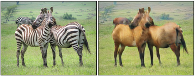 Рис. 157. Пример превращения лошадей в зебр и наоборот моделью CycleGAN
