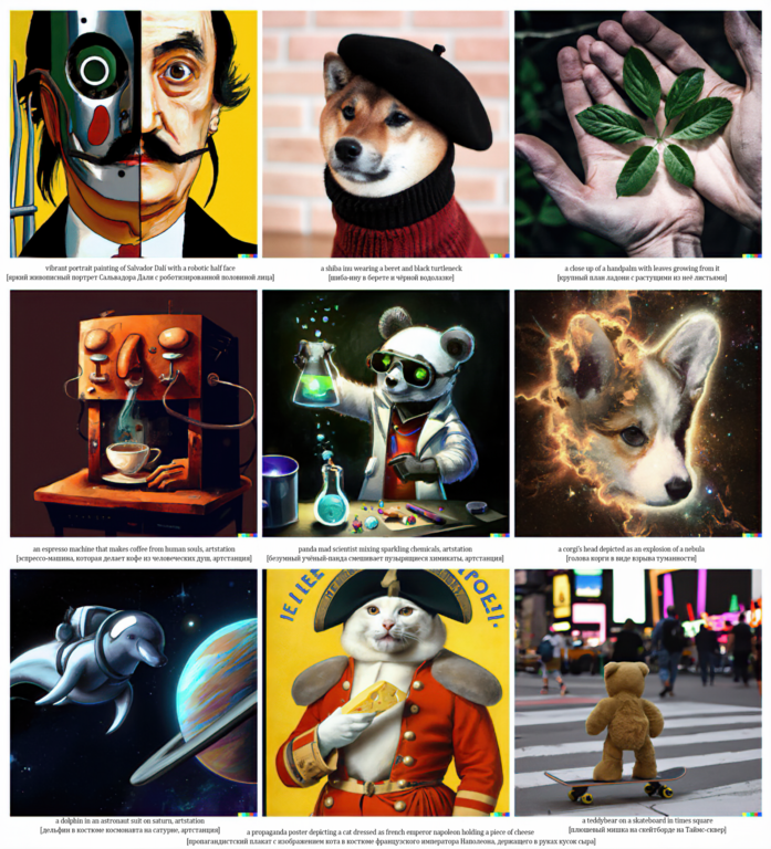 В 2021 г. моя команда стала одним из участников проекта по созданию русскоязычного аналога модели DALL·E. В начале ноября плодом объединённых усилий Управления экспериментальных систем машинного обучения, наших коллег из Sber AI, а также команды исследователей Самарского университета при деятельной помощи специалистов из SberCloud, обеспечивших нас ресурсами суперкомпьютеров «Кристофари» и «Кристофари Нео», на свет появились модели ruDALL-E XL (Malevich) с 1,3 млрд параметров, ruDALL-E XXL (Kandinsky) с 12 млрд параметров и две версии модели ruCLIP. С возможностями ruDALL-E XL вы можете познакомиться на сайте rudalle.ru или воспользовавшись виртуальными ассистентами семейства «Салют».
